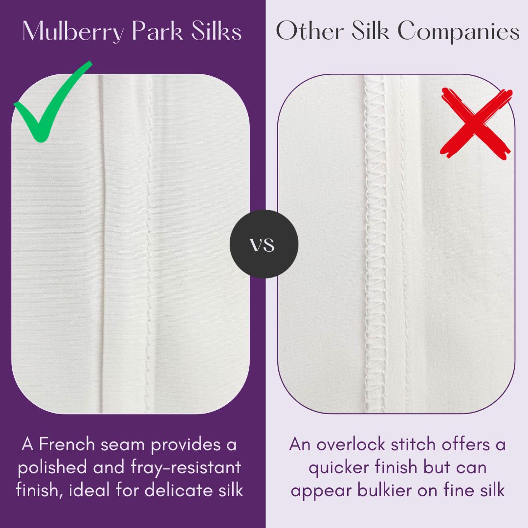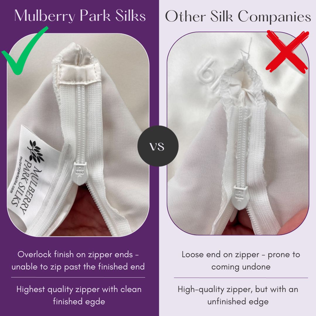 Our relentless pursuit of excellence led us to source the world's most exquisite silk - Grade 6A long-strand mulberry silk, woven into a luxuriously smooth charmeuse weave. Indulge in the meticulous French seams, a testament to our dedication to flawless construction. Forget messy overlock seams; experience the enveloping comfort of our generously sized envelope closures. Even the zippers are meticulously crafted, color-matched, and securely sewn using a closed-end technique - a testament to our commitment to an unparalleled experience.