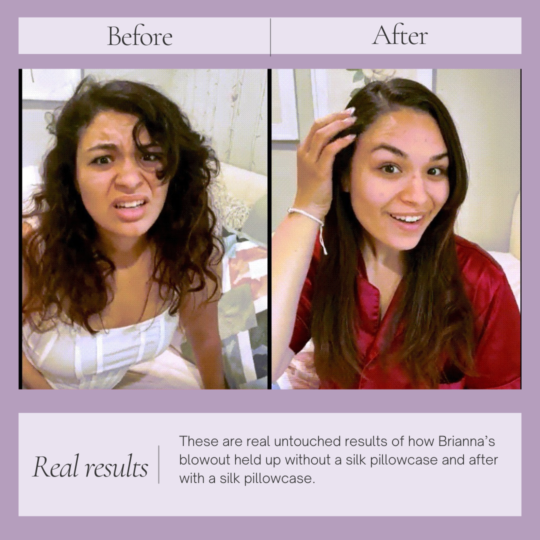 If you wake with a head full of tangles, it's likely due to friction from your cotton pillowcase. Silk pillowcases let your hair glide across their surface instead of snagging, no matter how much you toss and turn. This reduced friction not only prevents the formation of bedhead but also minimizes the risk of hair breakage and split ends. Silk is also gentler on your hair compared to rougher pillowcase materials, further reducing the chances of hair getting knotted or tangled while you sleep. You'll get a new morning look: smoother, silkier, and tangle-free. Additionally, silk pillowcases are less absorbent than cotton, helping to maintain hair hydration and prevent tangles and frizz. The gentle texture of silk minimizes knots, preserving your hairstyle overnight and reducing frizz by minimizing friction and static electricity. Silk offers a range of benefits for hair care, including protecting fragile or newly regrown hair from breakage.